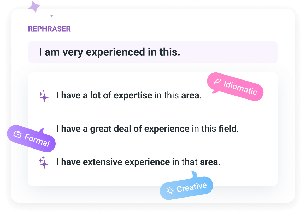 Spending too much time trying to find the perfect language, tone, or style to phrase your ideas? We get it. Ginger is more than a grammar checker, spell checker, and punctuation checker. Ginger is an all-in-one writing tool that includes Rephrase to empower you to write your best in ways that traditional online grammar checkers can’t. Just enter your sentence and our AI will provide reliable and useful alternatives: a bit shorter, a tad longer, more formal, direct, or creative. Make the Most Out of Rephrase